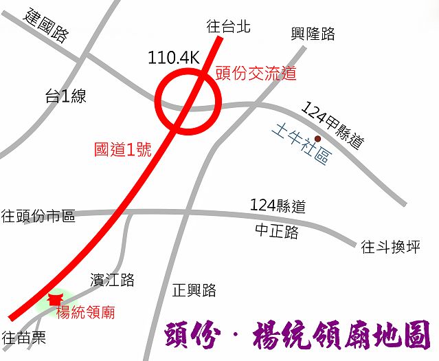 道路旁立有一塊頭份鎮的觀光旅遊導覽地圖,順便看看景點資訊,其中標示了一間楊統領廟,就在頭份交流道附近。