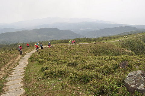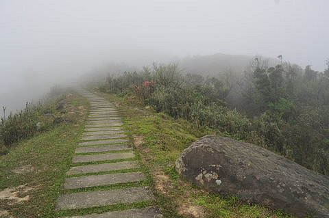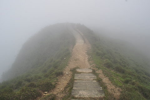 續往前行,又飄起毛毛細雨。迷霧中,登抵里程1.3K的草嶺山;接著下行,然後上爬至里程2K處的另一山頭,