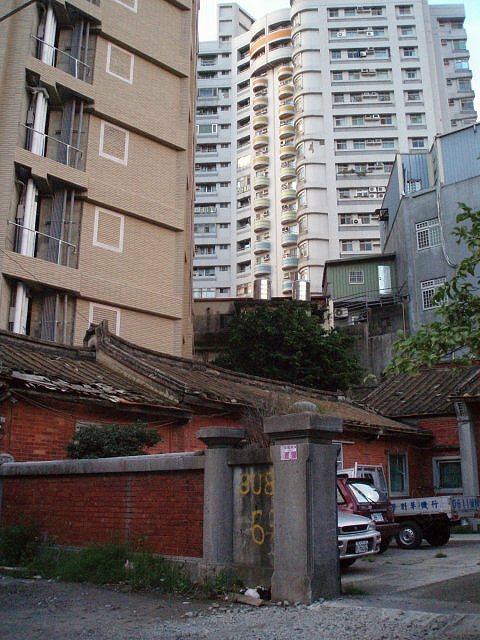 於高樓大廈後方的古厝。其旁一棟新的住宅大樓正在興建中。