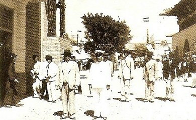 本町通(重慶南路)。從路旁的豎立的招牌裝飾寫著「祝台博」,判斷照片應拍攝於1935年。