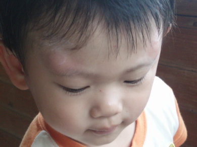 今天此行結果圓滿。不過還是有點小插曲。下山後,突然發現小東左右額頭各被蚊蟲叮咬了一個小包,沒過多久,竟