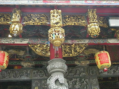 木雕作工細膩講究,通樑上的螭虎、獅座,通樑下的員光、拖木,雕工繁複華麗,富於藝術性。