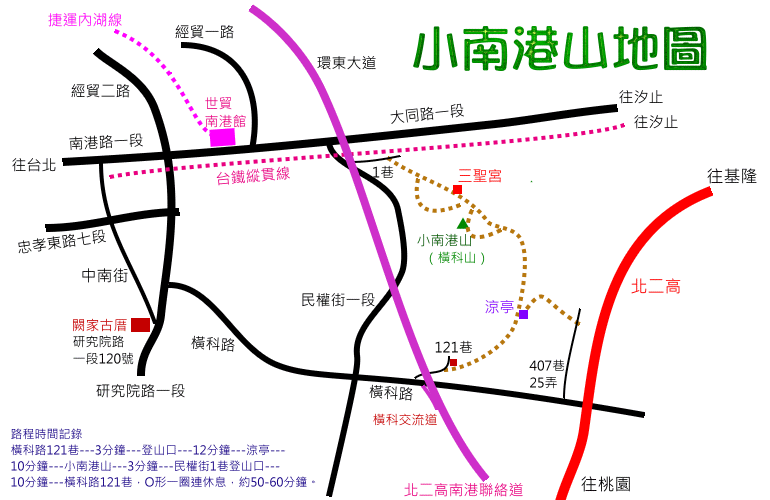 橫科路121巷---3分鐘---登山口---12分鐘---涼亭---10分鐘---小南港山---3分鐘---民權街1巷登山口---10分鐘---橫科路121巷,O形一圈連休息,約50-60分鐘。
