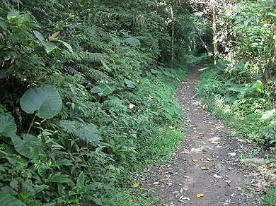 即轉為平緩的山腰路,自此之後,古道一路緩緩爬升,沿途林蔭怡然,路旁草蕨綠意盎然。