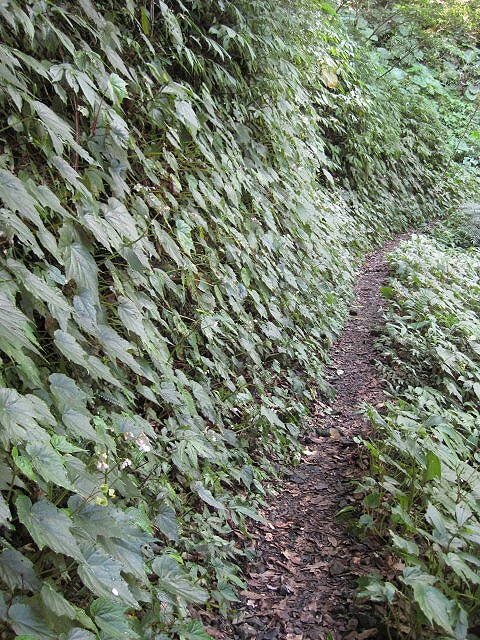 由工寮續行,古道愈入深林,景致愈幽,這時路旁壁坡出現一整片的水鴨腳,一路綿延相伴。