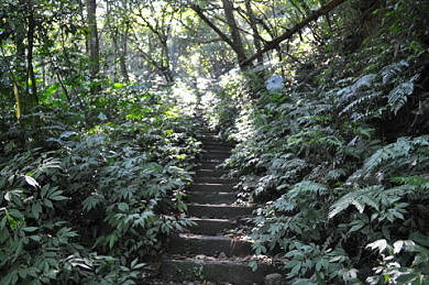 經過1K的古厝遺址後,山徑逐漸變陡,驀然出現一段古樸的舊石階路,勾起歷史的懷想。接著山徑變窄,