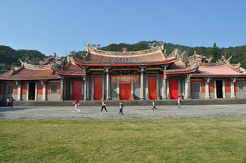 前有草坪,後有山峰,頗具大廟氣勢。走入內庭,正殿位於中庭,台基高起,四周有走馬廊及廊柱環侍,歇山重簷式的屋頂,型式像萬華龍山寺,