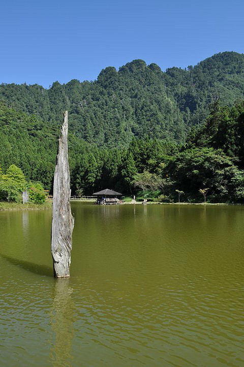 我則覺得湖中的枯木似是追悼逝去的檜林巨木。如今湖岸周遭的山巒,一片蒼翠蓊鬱,已是後來造林復育的森林景象。
