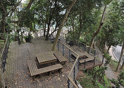 前行不久,石階路與小車道會合,彼此共用路段,上行之後,抵達一處平台,步道旁有圓形的大水塔。