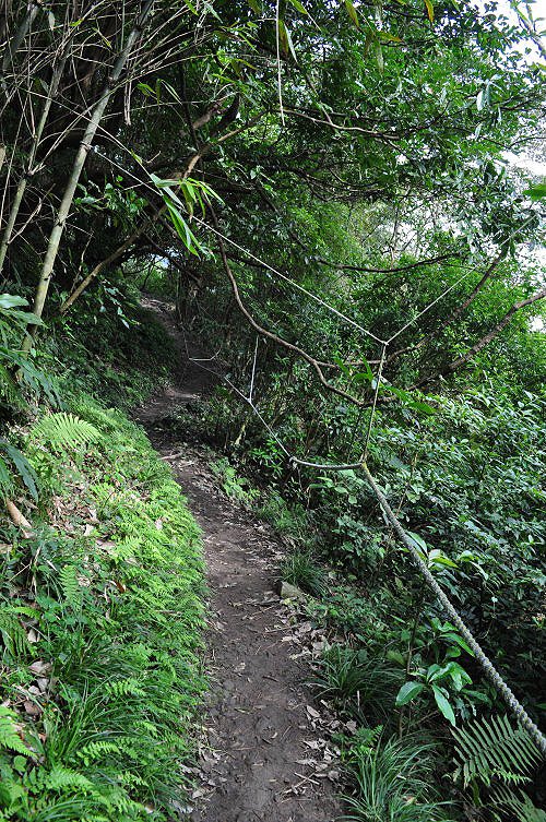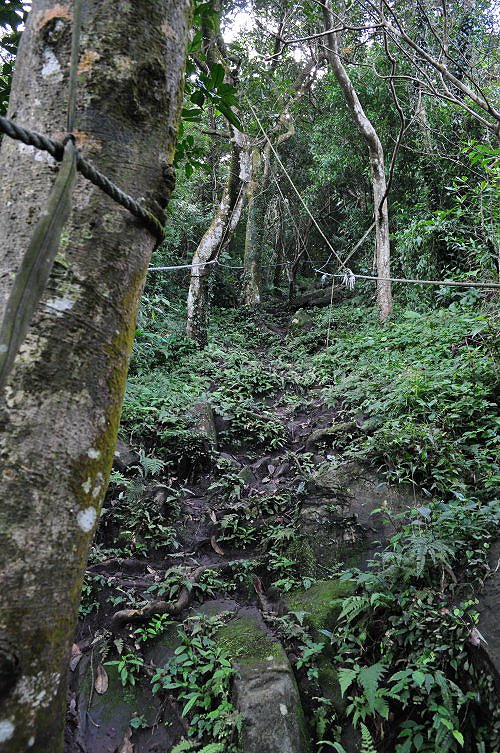 前行約十分鐘,平緩的腰繞路卻嗄然而止,轉成極為陡峭的山徑,得拉著繩索攀爬而上。這樣的山路,