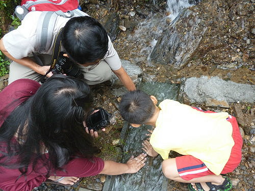 冰涼的山泉。手掌一起浸水,比比看誰撐得久?