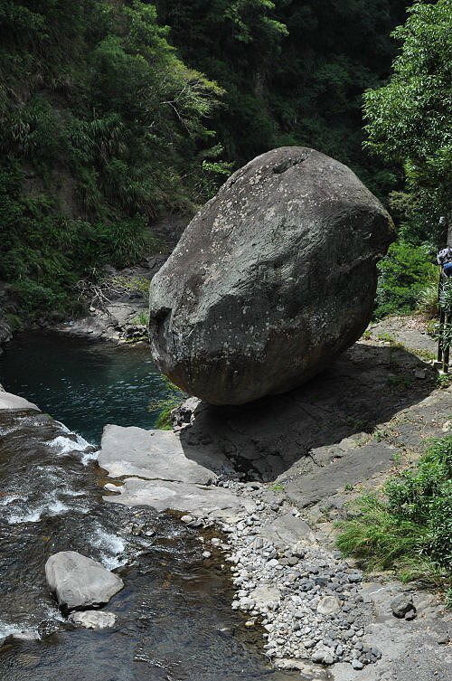 風動石,立於小烏來瀑布崖頂河岸斜坡。