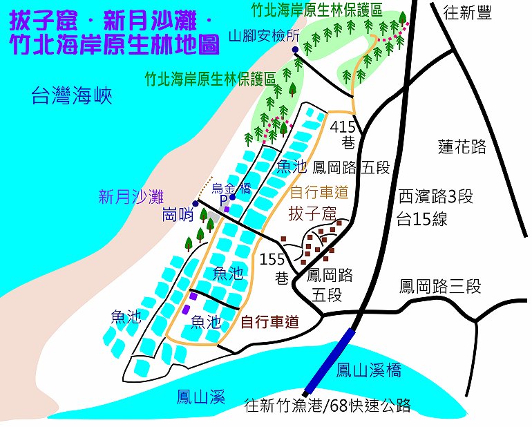 除了烏魚養殖產業之外,拔子窟有兩個自然景點,一是新月沙灘,一是竹北海岸原生林保護區。