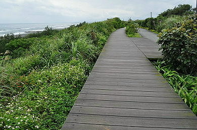 高架的棧道通往海灘,海濱公園主要的特色是海景及沙灘,公園面向遼闊的太平洋,海上近處有龜山島,沙灘則綿延十幾公里,