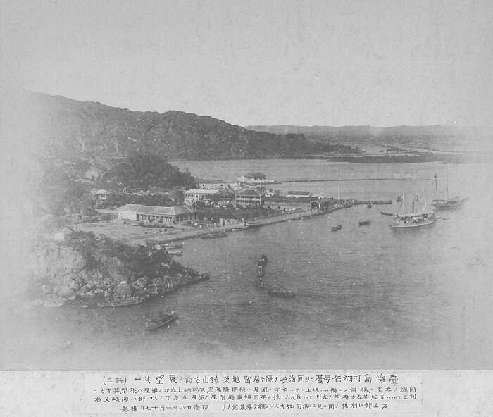 ◎打狗海峽的光景:峭壁上方的建築物為英國領事官邸,下方的小建築為砲台據點。