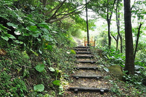 步道鋪設細碎石子,而步道所處的丘陵地,起伏不大,上下坡鋪有仿枕木的階梯,間雜碎石泥土,踏踩舒適。